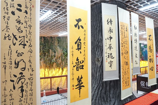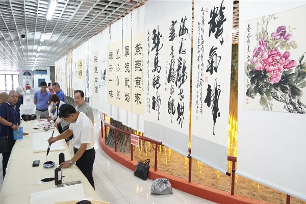 挽袖、研墨、調(diào)色、揮毫,書畫家們進(jìn)行現(xiàn)場(chǎng)書畫創(chuàng)作并交流創(chuàng)作心得。以書言志、以畫寄情,一幅幅極富感染力的書法、繪畫作品,抒發(fā)了對(duì)黨的敬愛之情和對(duì)祖國的美好祝愿?;顒?dòng)現(xiàn)場(chǎng)共展出書畫作品百余件。