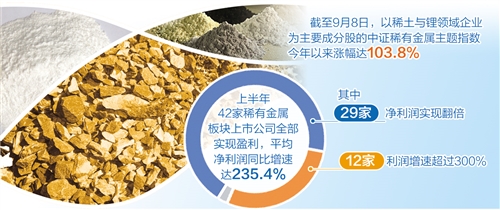 近幾個月,A股稀有金屬板塊呈現上漲行情。截至9月8日,以稀土與鋰領域企業(yè)為主要成分股的中證稀有金屬主題指數今年以來漲幅已達103.8%。