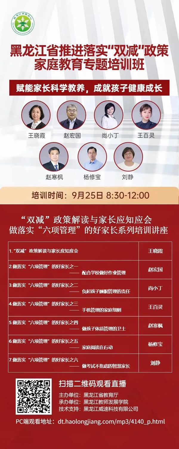 據(jù)了解,此次培訓(xùn)是《黑龍江省中小學(xué)“百萬(wàn)家庭賦能”工程實(shí)施方案》重要組成部分,也是省教育廳踐行黨史學(xué)習(xí)教育“我為群眾辦實(shí)事”,解決群眾急難愁盼問(wèn)題的具體舉措,由省教育廳主辦、黑龍江教師發(fā)展學(xué)院承辦,基礎(chǔ)教育處處長(zhǎng)領(lǐng)銜六位家庭教育專(zhuān)家共同開(kāi)講,時(shí)長(zhǎng)三個(gè)半小時(shí),受到廣大家長(zhǎng)的一致好評(píng),取得良好的社會(huì)反響,直播時(shí)瀏覽峰值達(dá)到210.7萬(wàn)人次。培訓(xùn)內(nèi)容緊緊圍繞廣大家長(zhǎng)們“雙減”形勢(shì)下的困惑,深入宣傳“雙減”政策和年初以來(lái)教育部相繼下發(fā)的關(guān)于手機(jī)、作業(yè)、睡眠、讀物、體質(zhì)、考試等“六項(xiàng)管理”文件內(nèi)容,分七個(gè)專(zhuān)題進(jìn)行深入細(xì)致的家庭教育指導(dǎo),有的放矢地解答家長(zhǎng)“心中所疑”、化解家長(zhǎng)“心中所急”,很多家長(zhǎng)通過(guò)家庭學(xué)校群進(jìn)行交流,有的家長(zhǎng)反饋道:“通過(guò)觀看直播我們家長(zhǎng)深刻體會(huì)到一定要以身作則,在孩子面前少玩手機(jī),多陪孩子閱讀書(shū)籍,多讓孩子進(jìn)行戶(hù)外活動(dòng)?!庇械募议L(zhǎng)則表示,聽(tīng)了講座深刻理解了孩子成長(zhǎng)的根基深植于家庭教育的道理,家庭教育才是孩子的起跑線(xiàn),主動(dòng)地配合學(xué)校落實(shí)“雙減”政策,從做好“六項(xiàng)管理”入手科學(xué)優(yōu)化家庭教養(yǎng)方式,減少孩子的校外培訓(xùn)和作業(yè)負(fù)擔(dān),還給孩子一個(gè)幸福的童年,做一名智慧家長(zhǎng)。