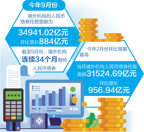 境外機構(gòu)對人民幣債券熱情持續(xù)高漲。數(shù)據(jù)顯示,9月份境外機構(gòu)人民幣債券托管面額為34941.02億元,較8月份增加884億元,環(huán)比增量創(chuàng)今年3月份以來新高。截至9月份,境外機構(gòu)已連續(xù)34個月增持人民幣債券。