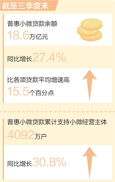 中國(guó)人民銀行發(fā)布的最新數(shù)據(jù)顯示,截至三季度末,我國(guó)普惠小微貸款余額18.6萬億元,同比增長(zhǎng)27.4%,比各項(xiàng)貸款平均增速高15.5個(gè)百分點(diǎn)。普惠小微貸款維持較高的增長(zhǎng)態(tài)勢(shì),繼續(xù)保持量增、面擴(kuò)、價(jià)降、結(jié)構(gòu)優(yōu)化的特點(diǎn)。
