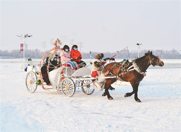 游客在松花江冰雪嘉年華景區(qū)體驗雪地馬車。