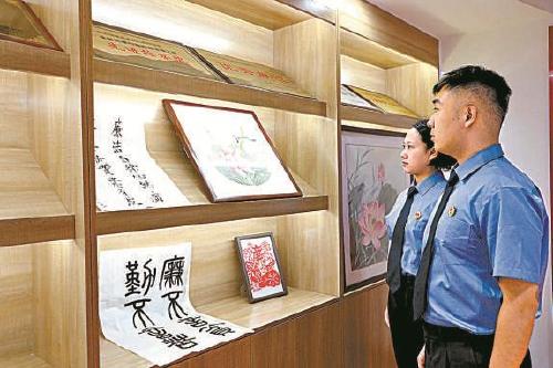 9月8日,黑龍江省牡丹江市東安區(qū)檢察院青年干警駐足觀看廉潔書畫作品